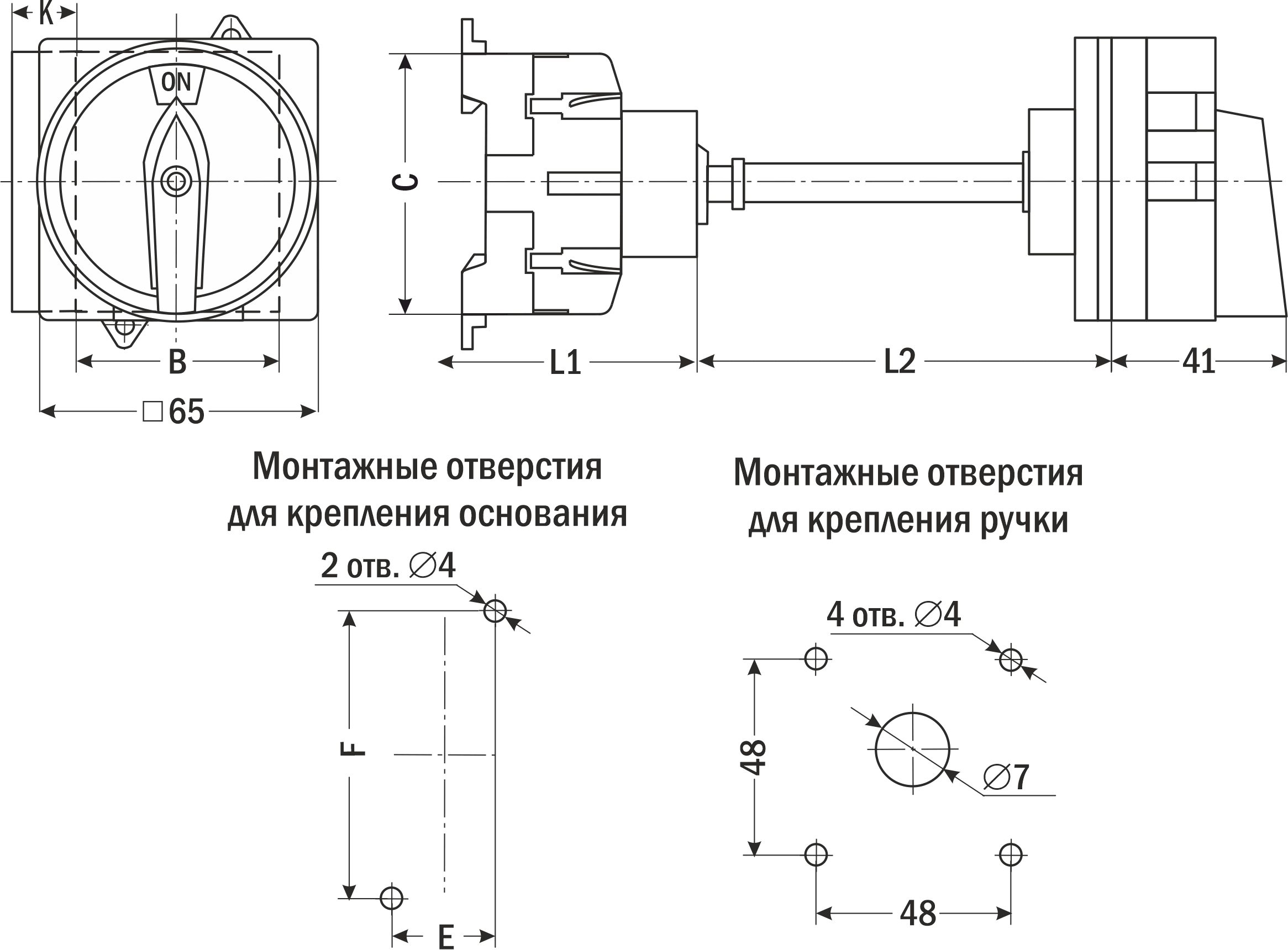 - Простой монтаж ручки на переднюю или боковую панель щита, а основания на DIN-рейку или плоскость