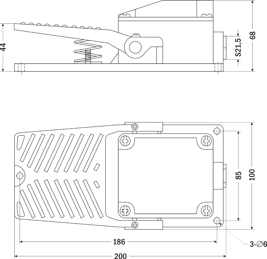 - 3 монтажных отверстия ∅ 6 мм для фиксации педали на плоскости