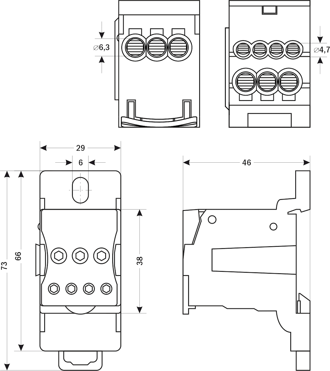 Исполнение корпуса с пазом и ответным шипом позволяет соединять кроссмодули в плотные блоки, что очень важно при установке на DIN-рейку при работе с проводами большого сечения, где требуются существенные усилия зажима.