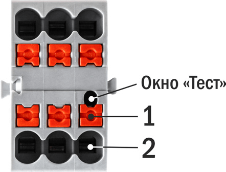 2. Для подключения необжатого провода нажмите крестовой или шлицевой отверткой на оранжевую кнопку 1 рядом с нужной клеммой, удерживая ее нажатой, вставьте зачищенный конец провода в отверстие 2. Следите за тем, чтобы с клеммой контактировала только зачищенная часть провода. Уберите отвертку. Пружинный зажим надежно зафиксирует провод в клемме.