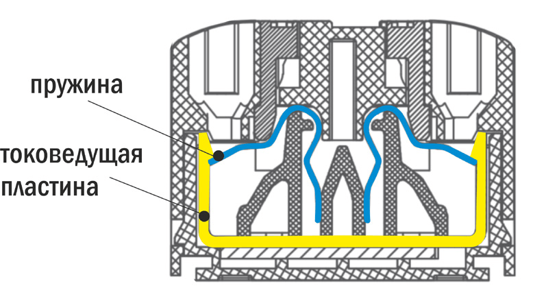 Пружинные зажимы обеспечивают постоянное самозажимное соединение, позволяют легко и быстро производить подключение и отключение проводов
