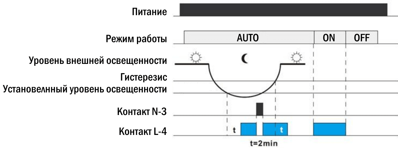 Как только уровень внешней освещенности опустится ниже установленного, начнется отсчет времени задержки срабатывания (2 минуты), а индикатор состояния реле будет мигать. По истечении времени задержки срабатывания контакт реле L-4 замкнется и загорится индикатор состояния реле.